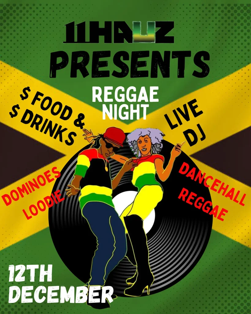 Tickets will include your entry, a delicious jerk chicken & festival bite, and full access to our island games like Loodi and Dominos—all while our in hauz DJ spins the best Dancehall and Reggae to keep the vibez high. Every guest is automatically entered into our raffle for a special 11Hauz prize. Come dressed to impress in your best Jamaican style and get ready for a night full of culture, laughter, dancing, fun, and flavor.